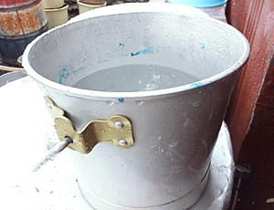 雨どいから落ちる雨を受けるバケツに みるみる間に雨水がたまってくる |