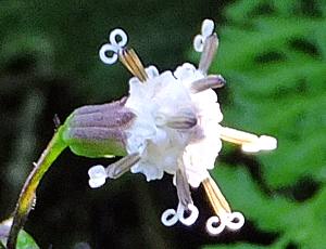 | ホタルブクロ:キキョウ科 『ホタルブクロはその部分が大きくめくれ上がって反転している付属体がある』・・・と 『付属体』ってこの垂れ下がっている緑色のもののこと? では、これは「ホタルブクロ」っていうことだね |