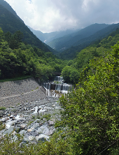 大樺沢上流を望む 立派な護岸工事の跡と、いくつもの堰堤の奥に 雪渓が小さく見えた |