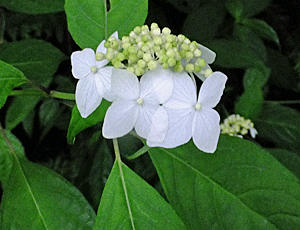 | ヤマアジサイ?:アジサイ科 緑の葉に白い装飾花が映える |