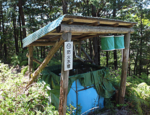 | 防火水槽「11」 先程、たくさんの人が休憩していた場所が それと知らずに通過した「大津谷林道」へ降りられる 分岐だったらしい この辺り、ぱたりと人影が無くなり 前にも後ろにも出会う人が無くなった |