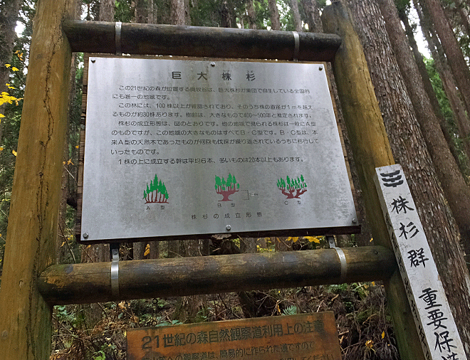 | 「巨大株杉」の案内 『この21世紀の森が位置する奥牧谷は、巨大株杉が集団で自生している全国的にも唯一の地域です。 この林には、100株以上が確認されており、そのうち株の直径が1mを越えるものが約30株あります。 樹齢は大きなもので400〜500年と推定されます。 株杉の成立形態は、図の通りです。 他の地域で見られる株杉は一般にA型のものですが、この地域の大きなものはすべてB・C型です。 B・C型は、本来A型の天然木であったものが何回も伐採が繰り返されているうちに移行して行ったものです。 1株の上に成立する幹は平均6本、多いものは20本以上もあります。』 (原文のまま) 「板取村教育委員会」の名前があった ![]() |