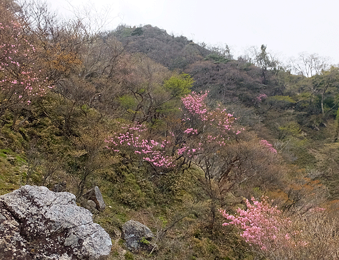 | 登山道右側の斜面にアカヤシオがいっぱい! |