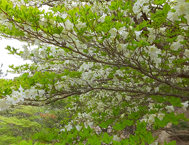 | シロヤシオ:ツツジ科 見事! シャクナゲだけではない こんなにたくさんのシロヤシオの花と株に出会えたのも初めて! 歩いても歩いても、次々に現れる |