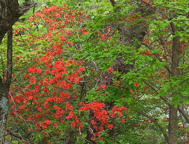 | ヤマツツジ:ツツジ科 だんだん標高が下がってくると、今度はヤマツツジの出番 濃い朱色の花が、緑にひときわ映える! |