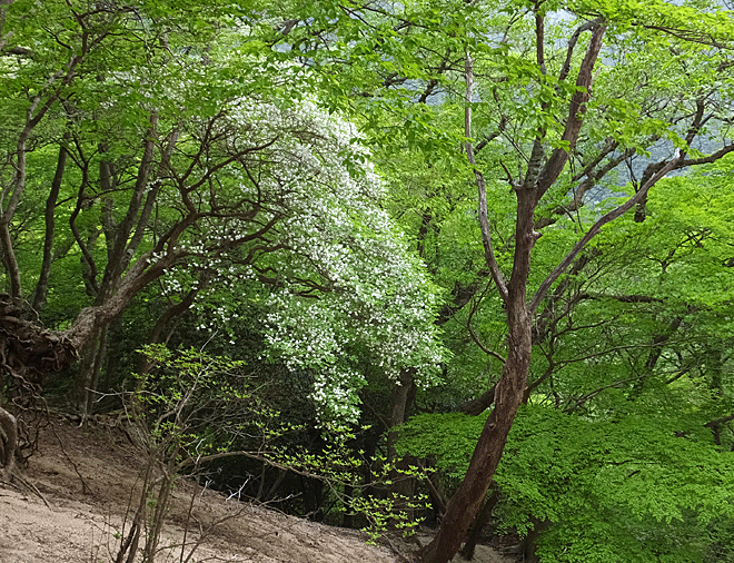 | シロヤシオ:ツツジ科 歩いていると、足元に白い花・・・シロヤシオだった ふと見上げると、あっちにもこっちにも緑の葉っぱの中に白い花がい〜っぱい咲いていた! わ〜い、嬉しいな! こんなにたくさん咲いているなんて 歩くごとに、右や左、近くや遠くに白い花が見える! カメラを向けていると、足が先へ進まないほど |