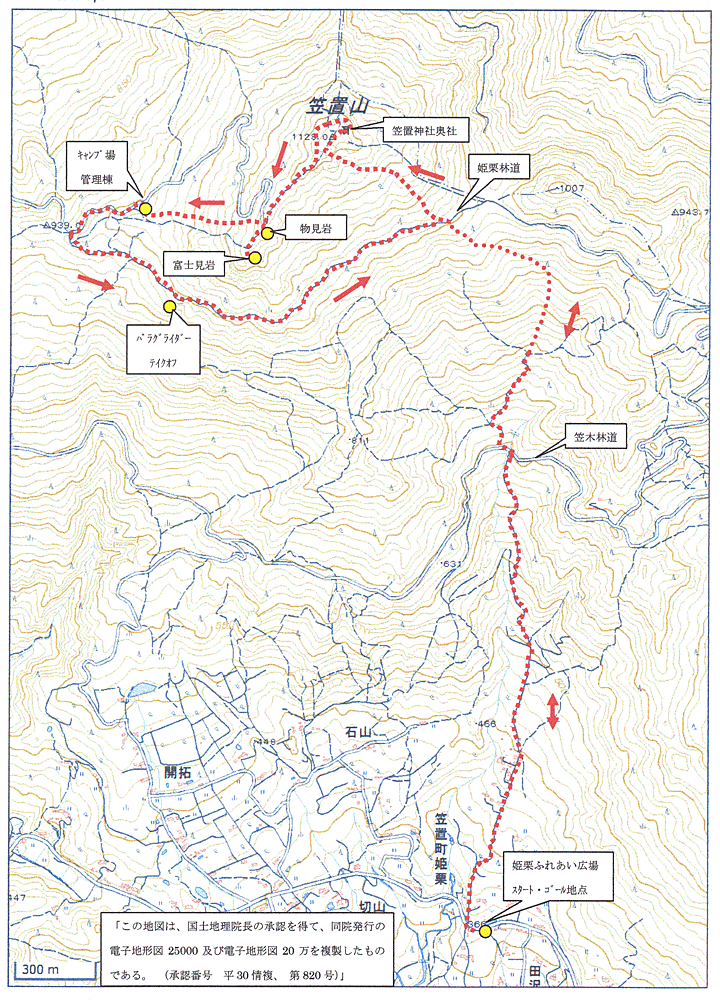 | ●コースタイム | 多治見 恵那IC ふれあい広場(P) 笠木林道出合 ヒトツバタゴ自生地 姫栗林道出合 おみたらし 笠置神社奥社(山頂) 物見岩 富士見岩 キャンプ場管理棟 大岩展望台 登山道分岐 笠木林道出合 別荘地入口 ふれあい広場(P) |