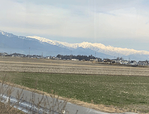 | まだ2月だというのに 車窓から見る風景は、春そのもの 屋根・畑・道路・近くの山に、雪は無し 松本で大糸線に乗り換えると やっと、右手に白い山々が見えてきた |