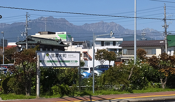 | 信濃大町駅 その後ろの左が爺ケ岳、その右が鹿島槍 そのまた右が五竜(遠くなってしまった!) |