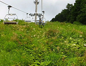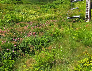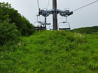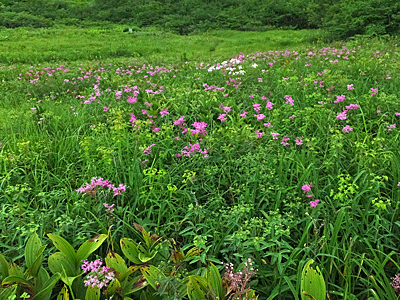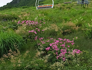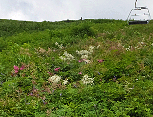 | ↑ 黒菱平の小さな湿原 ピンクはシモツケソウ・背の高いトウダイグサの仲間もある ここまで車で来て、ここからリフトに乗ることもできる |