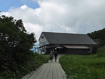 | 木道を歩きながら、振り返ると、 リフト乗り場と八方池山荘が見えた 下界は見えるが、山の上は雲の中 |