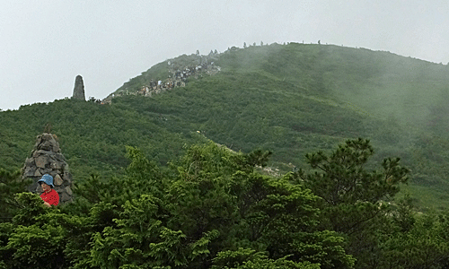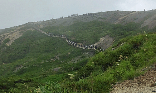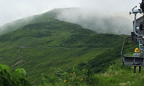 | ↑ もうすぐ終点 遊歩道を列をなして歩いている人の姿が見える~ ガスがどんどん上がってくる! |