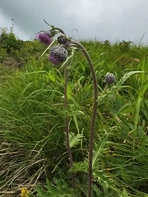 | オニアザミ:キク科 名前札に「オニアザミ」と書いてあった そっくりさんに「ハッポウアザミ」がある 『長い枝の先に1つずつ横から下向きにつくのが特徴』だって オニアザミは、『数個が集まってつく』との違いらしい |