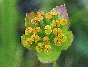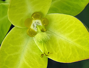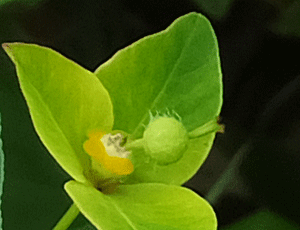 | ↑ 雄花は、黄色~橙色の腎臓型の腺体1個と →(4~5個の黄褐色~オレンジ色の腺体が見える *腺体=蜜を分泌する器官あるいは組織・匂いを持つ物質や粘液などを分泌する) 1個の雄しべからなる(いくら探しても雄しべしきものは写っていなかった・・・) 腺体から1個の雌花を伸ばす 雌花の花柱は3個、先が2裂する 果実は球形、いぼ状の突起があり、長い白毛が散生 (球形の果実・いぼ状の突起・3個の花柱・長い白毛は分かった) |