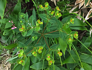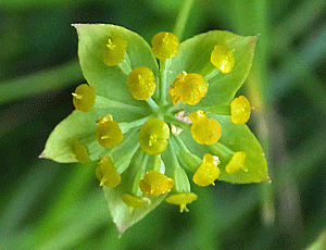 ↑ 茎頂の葉は楕円形で数個が輪生する →(下の方の葉ほど長くない) 輪生した葉の中心から数個の柄を出し →(ここでは、6本出ている 柄の先に3個の苞葉が付いている) |