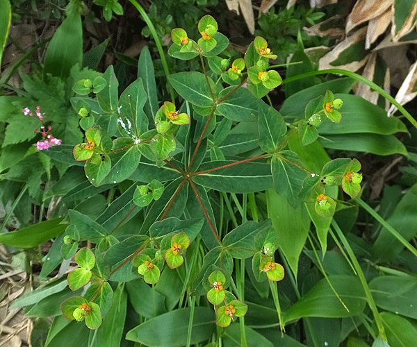 | ハクサンタイゲキ:トウダイグサ科 名前札に「ハクサンタイゲキ」と書いてあった トウダイグサの仲間は、一風変わった葉の付き方で 腺体というものもあって、複雑で大変興味深い 私のお気に入り 「ハクサンタイゲキ」の特徴をネットで調べてみた ↓ 『上部で短い葉が輪生して6個の枝を出し、3個の苞葉がついてさらに3個の小枝を出す。 雄花は1個の小苞片があり、雄しべ1個からなる。 葉は互生し、長さ3~7㎝の長楕円状披針形。 茎頂の葉は楕円形で数個が輪生する。 輪生した葉の中心から数個の柄を出し、 黄色の苞葉に包まれた杯状花序をつける。 杯状花序は4(まれに5)個の雄花と1個の雌花からなり、 苞葉は対生又は3個輪生する。 雄花はそれぞれ、黄色~橙色の腎臓型の腺体1個と雄しべ1個からなる 雌花の花柱は3個、先が2裂する。 果実は球形、いぼ状の突起があり、長い白毛が散生』 何のことやら・・・ やさしい日本語に翻訳しないと分かりにくいほどの複雑さ だから面白い! |