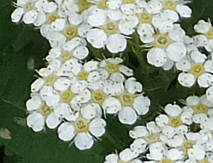 | イワシモツケ:バラ科 1つの花は、直径6~7ミリで5枚の花びら その小さな花がぎっしりくっついて咲いている 中央の薄黄色のものは、「腺体」だって |