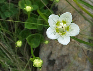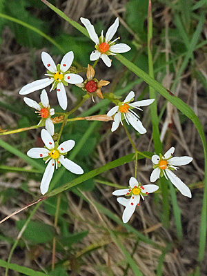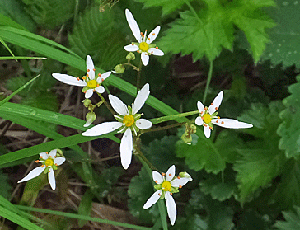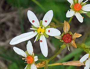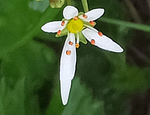 | ミヤマダイモンジソウ(大文字草):ユキノシタ科 咲いたばかりの雄しべの赤い葯が白地に映えて可愛い~ 赤い実も可愛い~ 漢字の「大」に見えるよね! |