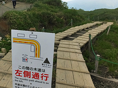 | ここで、尾根道と合流する 直ぐ近くにトイレもある 「左側通行」となっているが、 右側に面白い花がある時は 人がいないのを見てから、右側にもお邪魔した |
