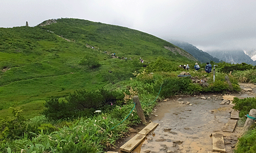 | 左奥の「八方ケルン」を過ぎて稜線へと続く人の列 左手前が「息(やすむ)ケルン」 |