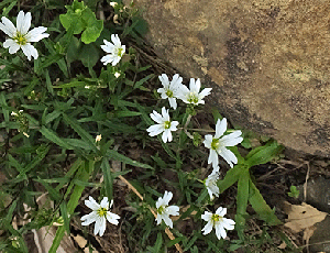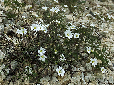 | ↑ この花も、クモマミミナグサかと思ったが、 葉っぱがとても細いので、違う花だろうか? でも花びらは2つに切れ込んでいるだけ・・・ |