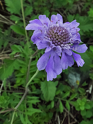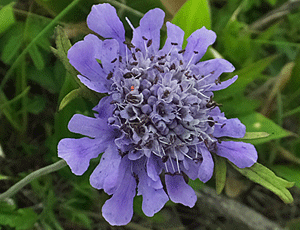 | タカネマツムシソウ:マツムシソウ科 左 周りの花は大きく、中心部の花は小さくて筒状 まだ中心部の花は開いていない 右 中心部にある筒状の花が開いている |