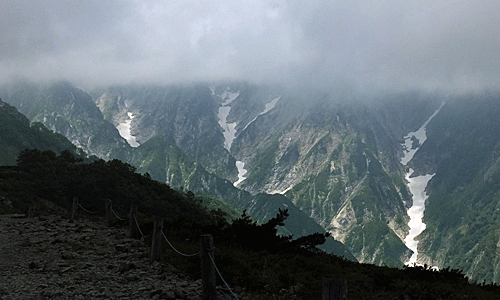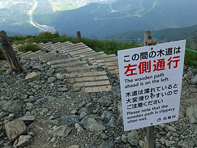 | 今日はなんだか足が重い ロッジから重いザックを担いで 20分近く歩いたからだろうか? 曇っているとはいえ、暑いからだろうか? とても唐松岳まで行けそうにもないので 八方池へ下りてのんびりすることに決め、 階段をどんどん降りていった |