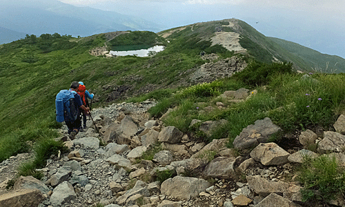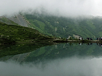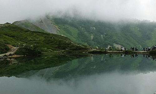 | 降りてきた方を振り返ると、 階段にも稜線にも、長い列~ 高校生が帰るらしい 彼らが帰った後は、静かな池になった |