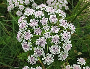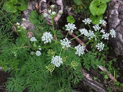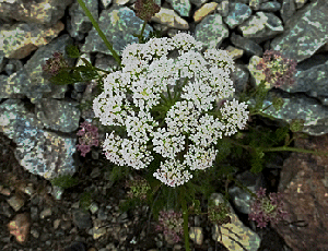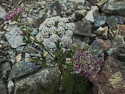 | タカネイブキボウフウ:セリ科 白い花と紫色の花が同居しているのが面白い |