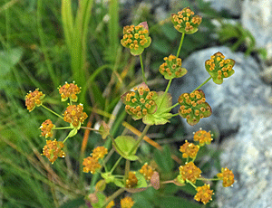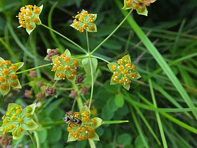 | ホタルサイコ:セリ科 (漢字で書くと「蛍柴胡」 これも私のお気に入り 枝分かれした先に変わった花をつける まるでお皿に可愛いお菓子を並べたように見える こんなに小さくても5枚の花びらを持つ・・・と |