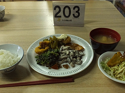 | 夕食は18時から ここは、ビュッフェスタイルで、お料理はボリュームも、種類もあって美味しい 何と言っても、温水シャワートイレが嬉しい! ・・・・・・・・・・・・・・・・・ 明日の天気は今日と同じようで、 朝のうちは晴れ 午後にわか雨があるとか じゃあ、明日はお弁当を朝食代わりにして食べ 早く出発して、早く帰ろうと決めた ・・・・・・・・・・・・・・・・・・・・・・・ |