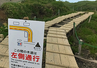 | 木道ななら、登り下りの2列に作ってあるので 尾根道より歩きやすいかと思って、右折 11:57 |