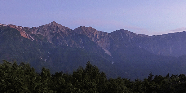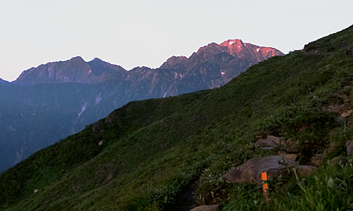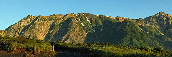 | 左前方の五竜が赤くなった! 左の双耳峰が鹿島槍 |