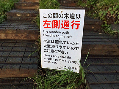 | 八方への分岐 9:28 さあ、気を付けて下ろう~ 少し下った、たらたらの所に、男性がこっち側(私の前) ちょっと向こうに女性が1人 2人ともじっと見合っているので、 お互いに写真を取り合っているカップルかなと思い 「通りま~す」と言って男性を追い越すと バタバタッとライチョウが右の斜面へ逃げていった 「ごめ~ん、写真撮り合っているのかと思った!」 ・・・と、男性と女性とライチョウに謝った 一言教えてほしかった・・・ |