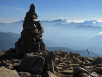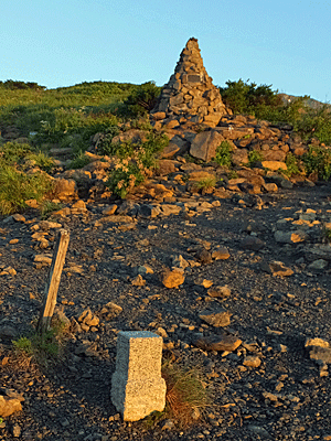 | 岩ゴツゴツの歩きにくい坂道を登ってケルンへ 5:28 「八方ケルン」 2035m 何だか、眉と鼻と口のある顔に見える・・・ |