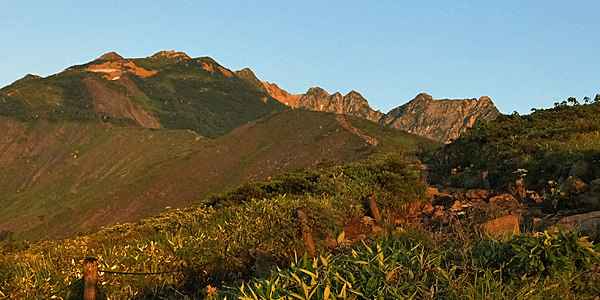 | こちらは、逆に左から ゴツゴツゴツの「不帰の嶮Ⅲ峰」、 その右の屋根のような「不帰の嶮Ⅱ峰」 そして、その右のとんがり山が、「不帰の嶮Ⅰ峰」 ぐんと下って、「天狗の大下り」 「不帰の嶮」から行けば、「天狗の大上り」になる そして、たらたらたらの大きな山が、「天狗の頭」 こんなによく見えるのは珍しい! 早く出た甲斐があった (帰りは雲の中だった 昨日も!) |