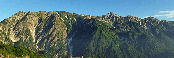 | 中央の一段と高い山が「劔」 その左に、剣御前や別山や大汝山が並んでいる 劔とは谷を挟んでいるが、ここから見ると同じ稜線に見える |
