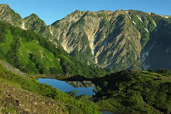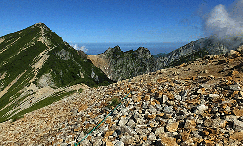 | ここから前方の展望がよくなる 右手の屋根のような山が「不帰の嶮Ⅱ峰」 その左にあるゴツゴツゴツが、「不帰の嶮Ⅲ峰」 そこから唐松岳へと続くのだが 手前の山に隠れて、コレ!とはっきりしない |