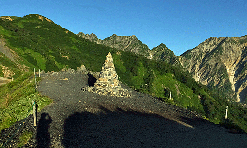 | 八方池を見下ろす稜線上にあるケルン 5:43 「第3ケルン」 2080m 昨日はこの先の「下ノ樺」入口から引き返した |