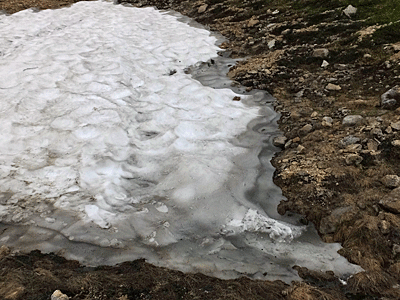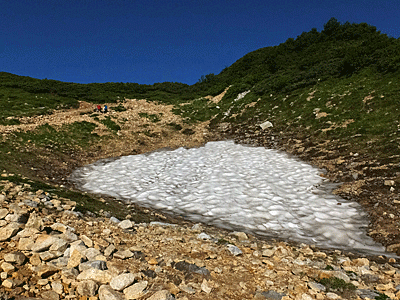 | 小さな雪渓が残っていた この辺り、遅くまで雪が残っていたので、(雪田) 花の種類が変わってきたのだろう |