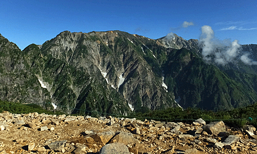 | 「扇雪渓」の近くまで行ってみた 6:42 雪渓が融けて流れていれば、 タオルマフラーを濡らそうと思ったのだが 見当たらなかった |