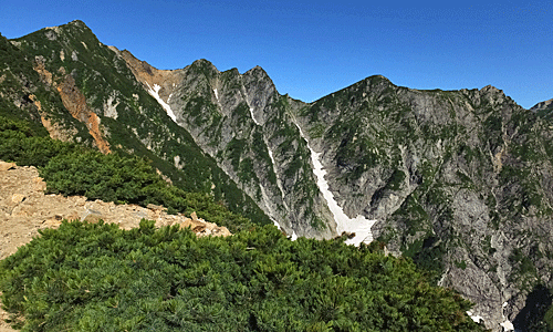 | 「不帰の嶮」も迫ってきた 右から、Ⅱ峰、Ⅲ峰 |