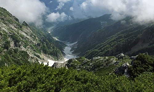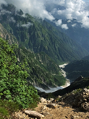 | 下の谷間を覗き込むと雪渓の名残り 雲がどんどん湧き上がってきた |