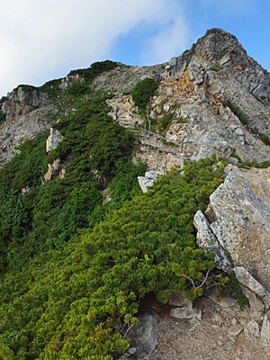 | 右手は切り立った崖 人が少ないので、すれ違いも少ない あの稜線まで出れば、後は安全・・・ |