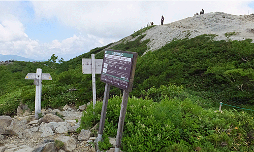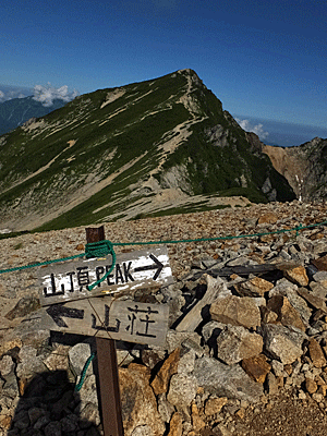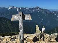 | 山頂に着いた~ 8:43 三角点もある 2695.9m 出発から約4時間25分で着いた 近年にない好調さ 理由を考えると、 1)昨日、八方池まで往復して高度順応ができていた 2)夜早めに寝て十分な睡眠量だった 3)早朝の涼しい時から歩き始めた 3)新しいサポーターが膝に合っていた 4)出発前にお握りをたべ、カロリー摂取していた・・・かな? 先客は5~6名 直ぐ後から同室だった関東の女性が登頂~ |