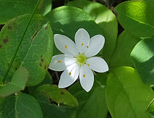 | ツマトリソウ:サクラソウ科 木の下、葉っぱに埋もれて咲いていた ここだけ 他では見つけられなかった |