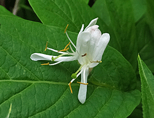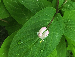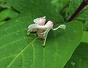 | オオヒョウタンボク:スイカズラ科 扇雪渓の傍で、見慣れないものを見つけた 上段 行きに見つけられなかった、長細いピンク色の物があった 初めて見た! あちこちに、この長細いピンク色があった 葉っぱの上に乗っているので、 もしかして・・・オオヒョウタンボクのつぼみかな?と思った 周りを見回すと、咲きかけた花や、 中段 2つくっついて咲いている白い花があり、 下段 もっと探すと、丸い実がなっている葉っぱもあった やっぱりオオヒョウタンボクだった! |