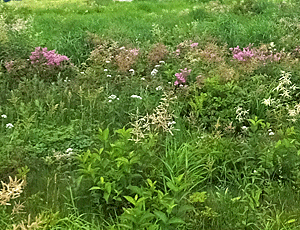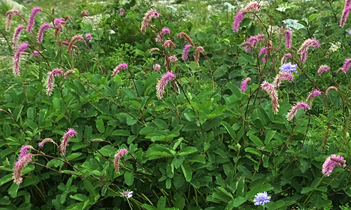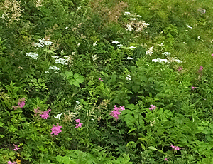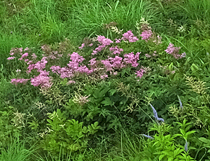 | ピンクのシモツケソウ 紫色の、タテヤマウツボグサ 白色は、ショウマの仲間 ずう~っと斜面に広がっていた |