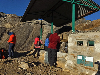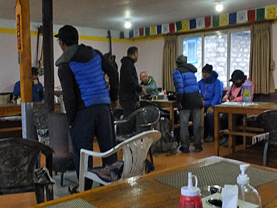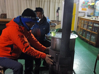 | 今日はロングコース ゴーキョピークと同じくらいの標高の レンジョパスを越えて 下って下って「ルンデン」まで歩く予定 約9時間くらいかかるらしい 4:40頃、ストーブは火が入ったばかり |