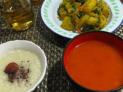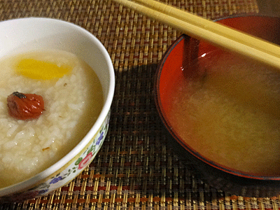 | 朝食 4:45頃 お粥とみそ汁だが、 お粥が全部食べ切れない・・・ |